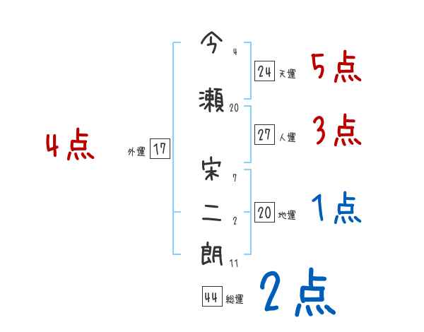 総運![]() | 今瀬宋二朗さんの総運は44画の2つ星!誠実で慎重な性格。物事を考えすぎないように注意しましょう。 あなたの人生を表す1番重要な運勢です。生涯を通じて影響する総合運となり、主に50歳以降の晩年期に影響を及ぼします。 |