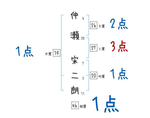 外運![]() | 仲瀬宋二朗さんの外運は19画の1つ星!優れた才能を持ちますが、協調性が足りないことも。周りの人と協力する事を意識しましょう。 生活面を象徴する運勢です。外部から受ける影響力を表し、結婚運、家庭運や職場、環境への順応性を表します。 |