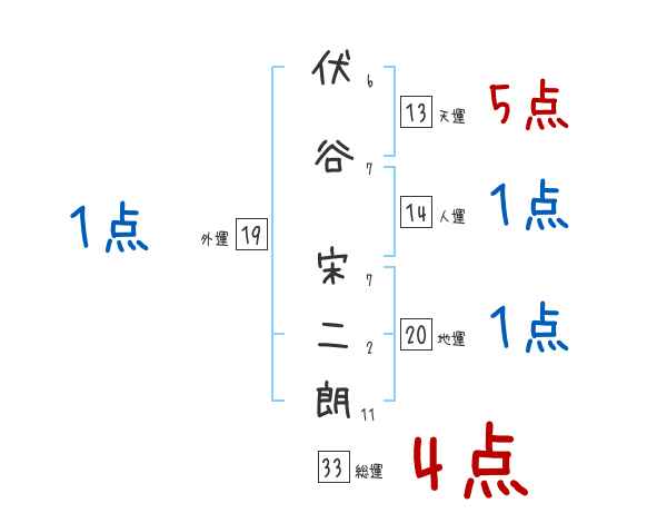 外運![]() | 伏谷宋二朗さんの外運は19画の1つ星!優れた才能を持ちますが、協調性が足りないことも。周りの人と協力する事を意識しましょう。 生活面を象徴する運勢です。外部から受ける影響力を表し、結婚運、家庭運や職場、環境への順応性を表します。 |
