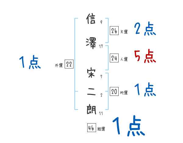 外運![]() | 信澤宋二朗さんの外運は22画の1つ星!努力することが苦手ないっぽう手先が器用。芸術性にも優れる。 生活面を象徴する運勢です。外部から受ける影響力を表し、結婚運、家庭運や職場、環境への順応性を表します。 |