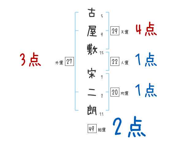 天運![]() | 古屋敷宋二朗さんの天運は29画の4つ星!完全主義で才能がある。厳格な心の持ち主。 家系が持つ宿命的な運勢を表します。祖先から受け継いだ苗字ですので自分の力が及びません。家柄を象徴します。 |