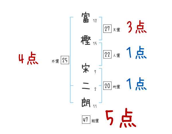 総運![]() | 富樫宋二朗さんの総運は47画の5つ星!実力が開花し発展する円満な人生。財に恵まれる。 あなたの人生を表す1番重要な運勢です。生涯を通じて影響する総合運となり、主に50歳以降の晩年期に影響を及ぼします。 |