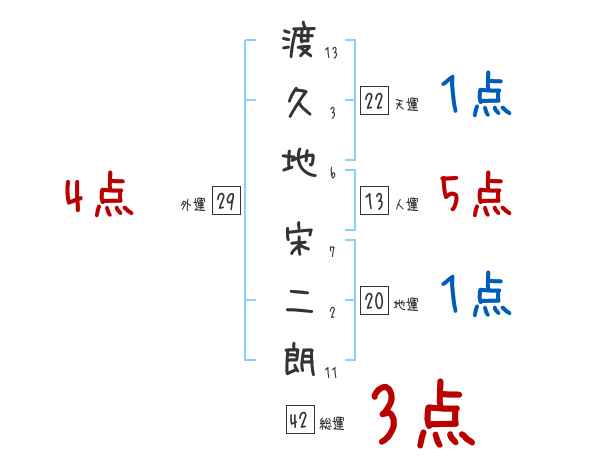 天運![]() | 渡久地宋二朗さんの天運は22画の1つ星!努力することが苦手ないっぽう手先が器用。芸術性にも優れる。 家系が持つ宿命的な運勢を表します。祖先から受け継いだ苗字ですので自分の力が及びません。家柄を象徴します。 |