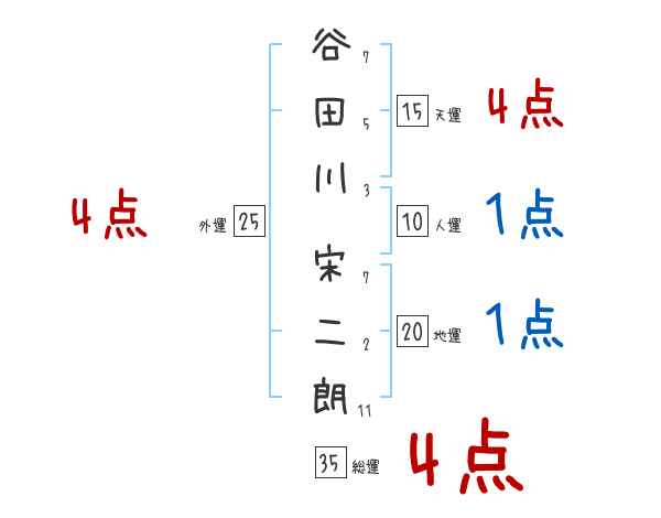 総運![]() | 谷田川宋二朗さんの総運は35画の4つ星!温厚な性格で感受性が高い。穏和な性格で人望が厚い。 あなたの人生を表す1番重要な運勢です。生涯を通じて影響する総合運となり、主に50歳以降の晩年期に影響を及ぼします。 |