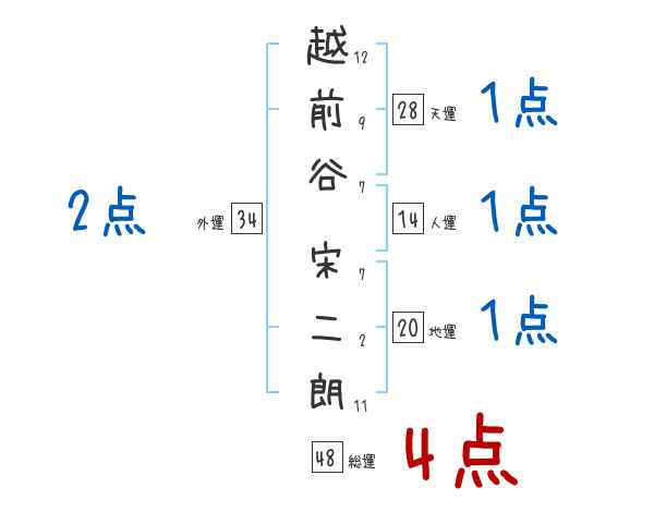 総運![]() | 越前谷宋二朗さんの総運は48画の4つ星!賢明な性格で人望が厚い。指導力があり多くの人に尊敬される。 あなたの人生を表す1番重要な運勢です。生涯を通じて影響する総合運となり、主に50歳以降の晩年期に影響を及ぼします。 |
