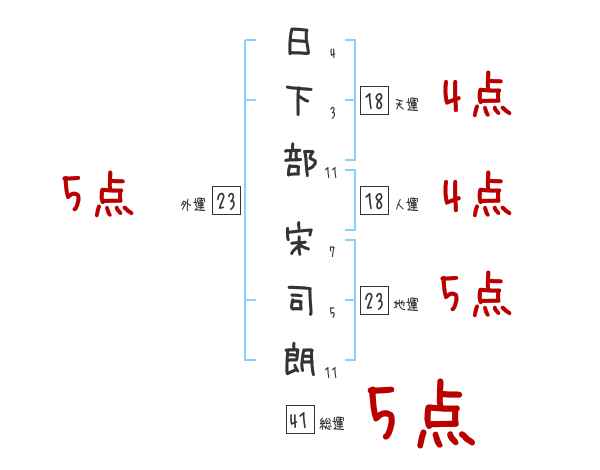 外運![]() | 日下部宋司朗さんの外運は23画の5つ星!想像力に優れ活力がある。一代で成功し名誉を手に入れる。 生活面を象徴する運勢です。外部から受ける影響力を表し、結婚運、家庭運や職場、環境への順応性を表します。 |