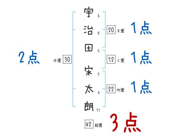 地運![]() | 宇治田宋太朗さんの地運は22画の1つ星!努力することが苦手ないっぽう手先が器用。芸術性にも優れる。 個性を表す基礎的な運勢です。性格形成や対人関係、行動力など家庭環境に影響されます。主に誕生してから20歳くらいまでの若年期の運勢を表します。 |