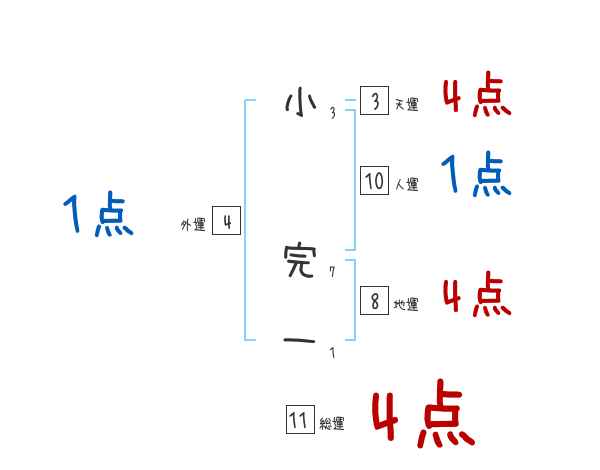 天運![]() | 小完一さんの天運は3画の4つ星!活動的で才能に恵まれ、多くの信頼を得る。希望に満ち成長する。 家系が持つ宿命的な運勢を表します。祖先から受け継いだ苗字ですので自分の力が及びません。家柄を象徴します。 |