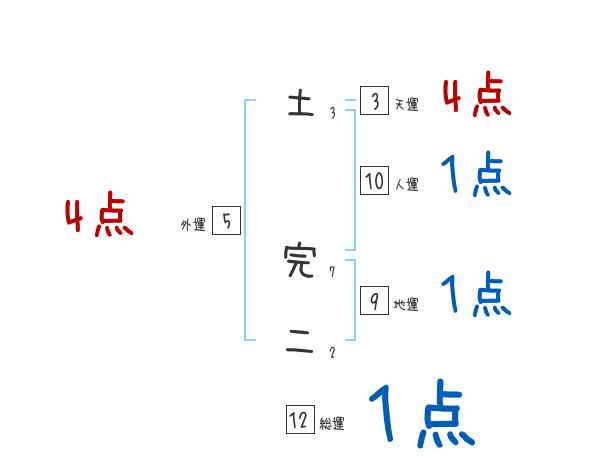 天運![]() | 土完二さんの天運は3画の4つ星!活動的で才能に恵まれ、多くの信頼を得る。希望に満ち成長する。 家系が持つ宿命的な運勢を表します。祖先から受け継いだ苗字ですので自分の力が及びません。家柄を象徴します。 |