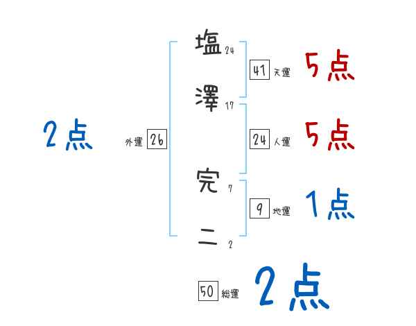 総運![]() | 塩澤完二さんの総運は50画の2つ星!浮き沈みが激しく不安定。しりすぼみに衰退しやすいので注意しましょう。 あなたの人生を表す1番重要な運勢です。生涯を通じて影響する総合運となり、主に50歳以降の晩年期に影響を及ぼします。 |