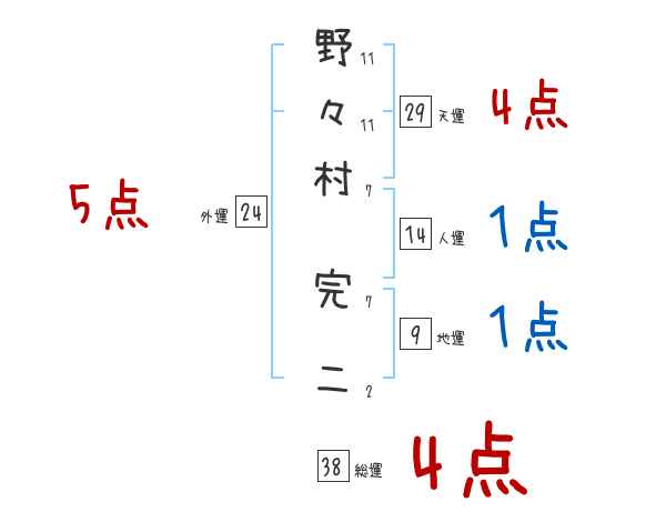 天運![]() | 野々村完二さんの天運は29画の4つ星!完全主義で才能がある。厳格な心の持ち主。 家系が持つ宿命的な運勢を表します。祖先から受け継いだ苗字ですので自分の力が及びません。家柄を象徴します。 |