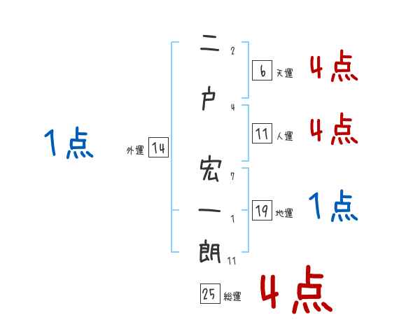 天運![]() | 二戸宏一朗さんの天運は6画の4つ星!慎重な努力家で信頼を得る。誠実な精神で向上心に優れる。 家系が持つ宿命的な運勢を表します。祖先から受け継いだ苗字ですので自分の力が及びません。家柄を象徴します。 |