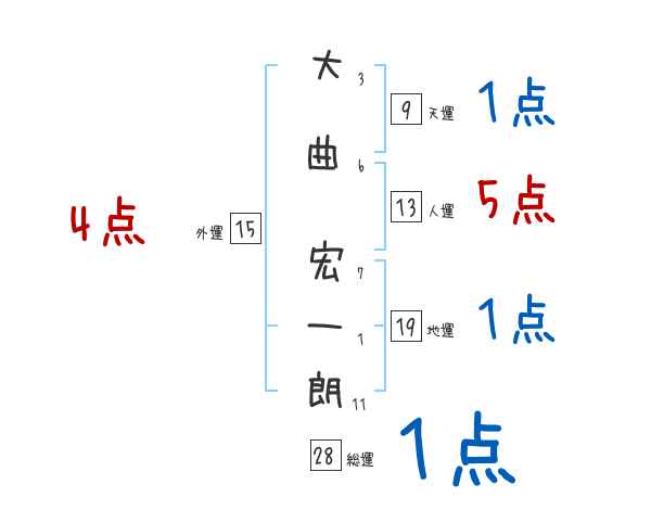 天運![]() | 大曲宏一朗さんの天運は9画の1つ星!消極的で才能を発揮することが苦手なことも。周りの意見に耳を傾けましょう。 家系が持つ宿命的な運勢を表します。祖先から受け継いだ苗字ですので自分の力が及びません。家柄を象徴します。 |