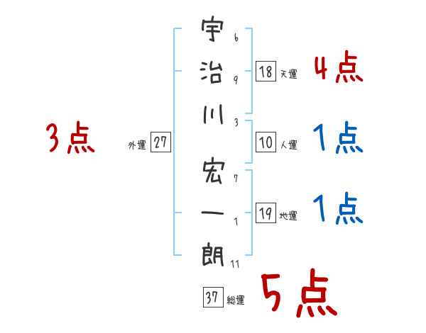 天運![]() | 宇治川宏一朗さんの天運は18画の4つ星!情熱的で剛気。忍耐力があり信頼される。 家系が持つ宿命的な運勢を表します。祖先から受け継いだ苗字ですので自分の力が及びません。家柄を象徴します。 |