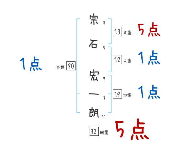 総運![]() | 宗石宏一朗さんの総運は32画の5つ星!柔軟性があり成功する。チャンスが多く金運が良い。 あなたの人生を表す1番重要な運勢です。生涯を通じて影響する総合運となり、主に50歳以降の晩年期に影響を及ぼします。 |