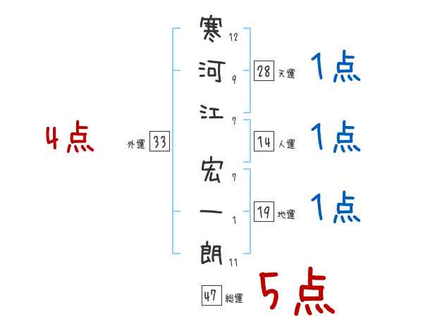 外運![]() | 寒河江宏一朗さんの外運は33画の4つ星!権力志向でプライドが高い。勇気があり運を切り開き成功する。 生活面を象徴する運勢です。外部から受ける影響力を表し、結婚運、家庭運や職場、環境への順応性を表します。 |