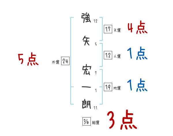総運![]() | 強矢宏一朗さんの総運は36画の3つ星!先見性が豊かです。多少神経質で苦労することも。 あなたの人生を表す1番重要な運勢です。生涯を通じて影響する総合運となり、主に50歳以降の晩年期に影響を及ぼします。 |