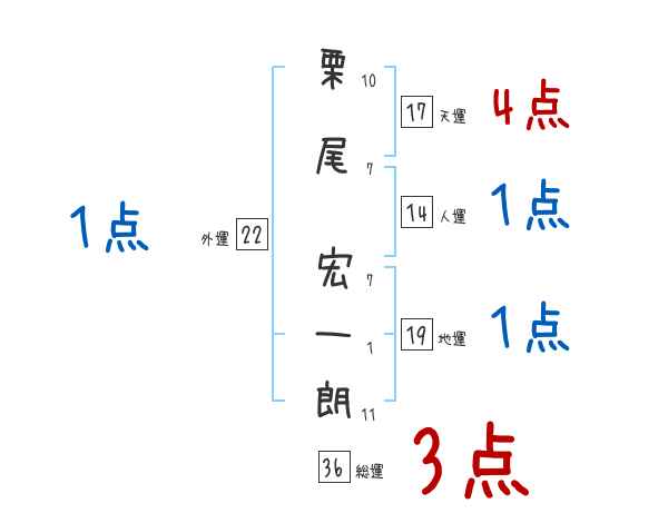 外運![]() | 栗尾宏一朗さんの外運は22画の1つ星!努力することが苦手ないっぽう手先が器用。芸術性にも優れる。 生活面を象徴する運勢です。外部から受ける影響力を表し、結婚運、家庭運や職場、環境への順応性を表します。 |
