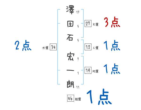 外運![]() | 澤田石宏一朗さんの外運は34画の2つ星!独創性に優れるが、自尊心が強く災難に注意しましょう。 生活面を象徴する運勢です。外部から受ける影響力を表し、結婚運、家庭運や職場、環境への順応性を表します。 |
