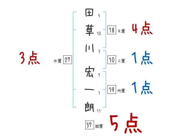 総運![]() | 田草川宏一朗さんの総運は37画の5つ星!努力家で順応性に優れる。現実的な考え方ができ忠実に物事をこなす。 あなたの人生を表す1番重要な運勢です。生涯を通じて影響する総合運となり、主に50歳以降の晩年期に影響を及ぼします。 |