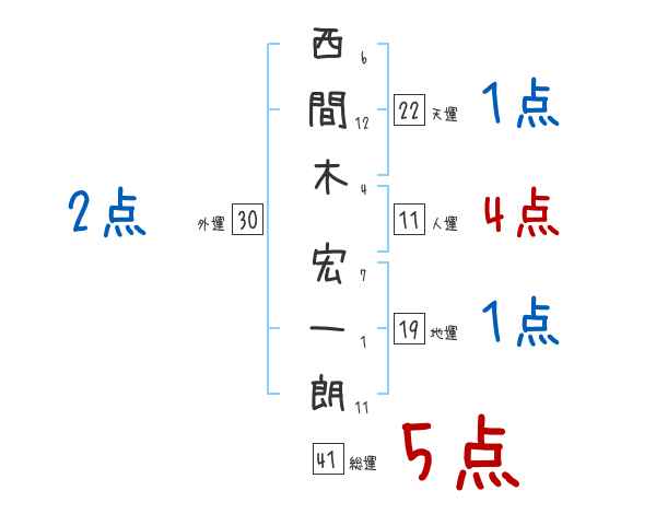 天運![]() | 西間木宏一朗さんの天運は22画の1つ星!努力することが苦手ないっぽう手先が器用。芸術性にも優れる。 家系が持つ宿命的な運勢を表します。祖先から受け継いだ苗字ですので自分の力が及びません。家柄を象徴します。 |
