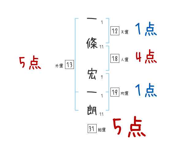 外運![]() | 一條宏一朗さんの外運は13画の5つ星!才能に恵まれ人気がある。名声を手に入れる。円満な人生。 生活面を象徴する運勢です。外部から受ける影響力を表し、結婚運、家庭運や職場、環境への順応性を表します。 |