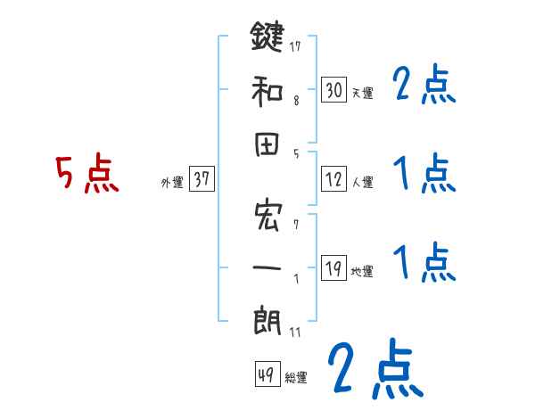 外運![]() | 鍵和田宏一朗さんの外運は37画の5つ星!努力家で順応性に優れる。現実的な考え方ができ忠実に物事をこなす。 生活面を象徴する運勢です。外部から受ける影響力を表し、結婚運、家庭運や職場、環境への順応性を表します。 |