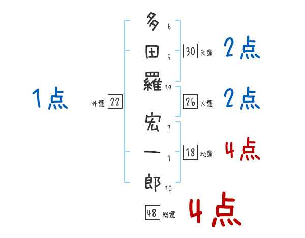 天運![]() | 多田羅宏一郎さんの天運は30画の2つ星!浮き沈みの激しさに注意しましょう。 家系が持つ宿命的な運勢を表します。祖先から受け継いだ苗字ですので自分の力が及びません。家柄を象徴します。 |