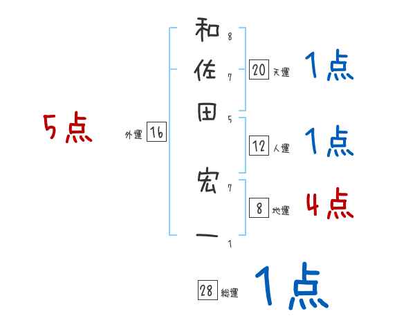 総運![]() | 和佐田宏一さんの総運は28画の1つ星!家庭環境に注意。スポーツで活躍できる能力があるかも。 あなたの人生を表す1番重要な運勢です。生涯を通じて影響する総合運となり、主に50歳以降の晩年期に影響を及ぼします。 |