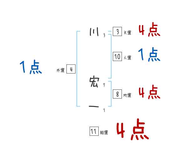 外運![]() | 川宏一さんの外運は4画の1つ星!感情が不安定で苦労するかも。周囲との協調を心掛けましょう。 生活面を象徴する運勢です。外部から受ける影響力を表し、結婚運、家庭運や職場、環境への順応性を表します。 |