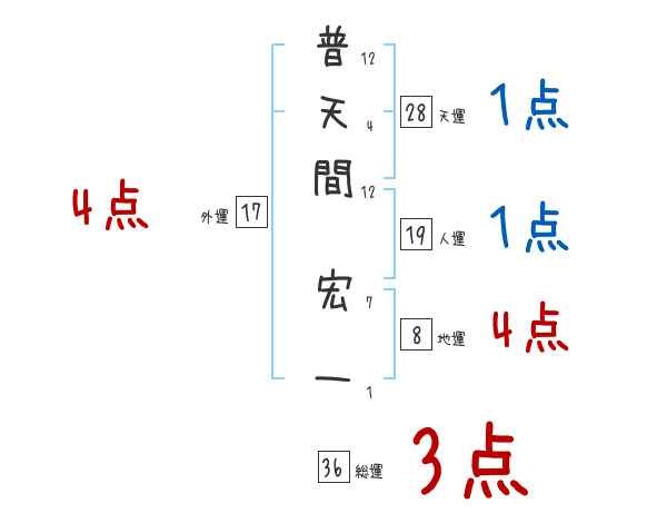 天運![]() | 普天間宏一さんの天運は28画の1つ星!家庭環境に注意。スポーツで活躍できる能力があるかも。 家系が持つ宿命的な運勢を表します。祖先から受け継いだ苗字ですので自分の力が及びません。家柄を象徴します。 |