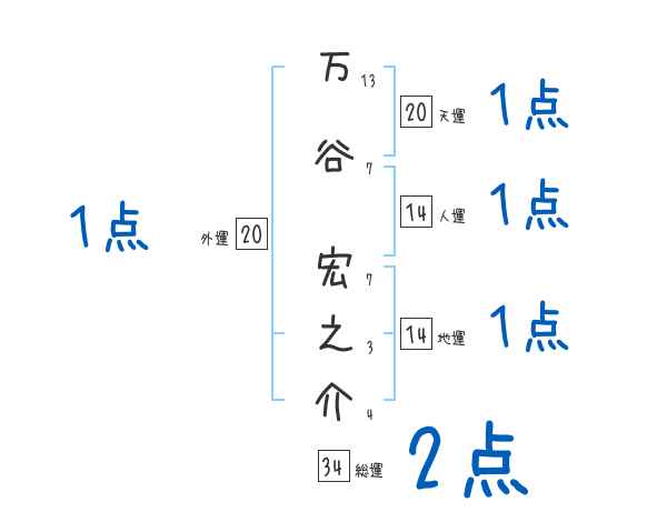 総運![]() | 万谷宏之介さんの総運は34画の2つ星!独創性に優れるが、自尊心が強く災難に注意しましょう。 あなたの人生を表す1番重要な運勢です。生涯を通じて影響する総合運となり、主に50歳以降の晩年期に影響を及ぼします。 |