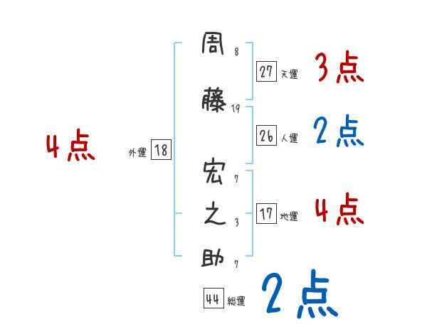 総運![]() | 周藤宏之助さんの総運は44画の2つ星!誠実で慎重な性格。物事を考えすぎないように注意しましょう。 あなたの人生を表す1番重要な運勢です。生涯を通じて影響する総合運となり、主に50歳以降の晩年期に影響を及ぼします。 |