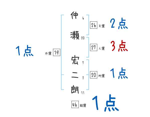 外運![]() | 仲瀬宏二朗さんの外運は19画の1つ星!優れた才能を持ちますが、協調性が足りないことも。周りの人と協力する事を意識しましょう。 生活面を象徴する運勢です。外部から受ける影響力を表し、結婚運、家庭運や職場、環境への順応性を表します。 |