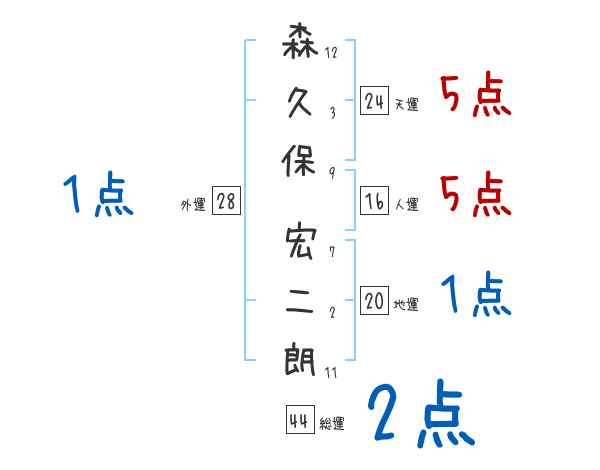 人運![]() | 森久保宏二朗さんの人運は16画の5つ星!人望が厚く大きく発展する。逆転成功が見える。 性格や才能などを表す2番目に重要な運勢です。人間関係や協調性、社会的な成功に影響します。主に20歳から50歳ぐらいまでの中年期の運勢を表します。 |