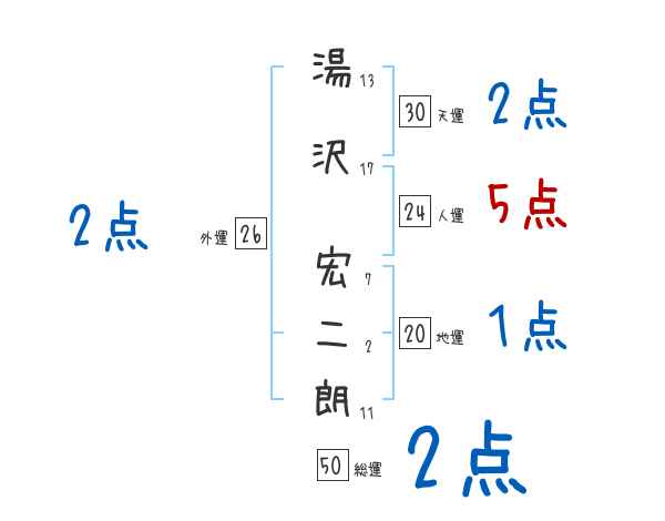 外運![]() | 湯沢宏二朗さんの外運は26画の2つ星!波瀾万丈かも。信頼できる人を大事にしましょう。 生活面を象徴する運勢です。外部から受ける影響力を表し、結婚運、家庭運や職場、環境への順応性を表します。 |