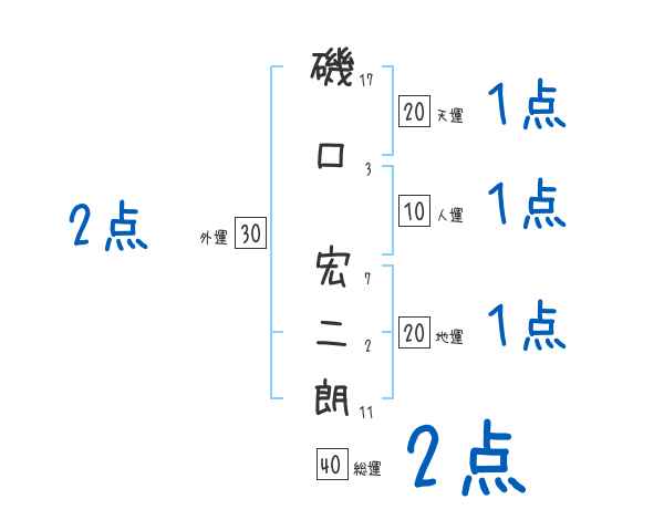 外運![]() | 磯口宏二朗さんの外運は30画の2つ星!浮き沈みの激しさに注意しましょう。 生活面を象徴する運勢です。外部から受ける影響力を表し、結婚運、家庭運や職場、環境への順応性を表します。 |