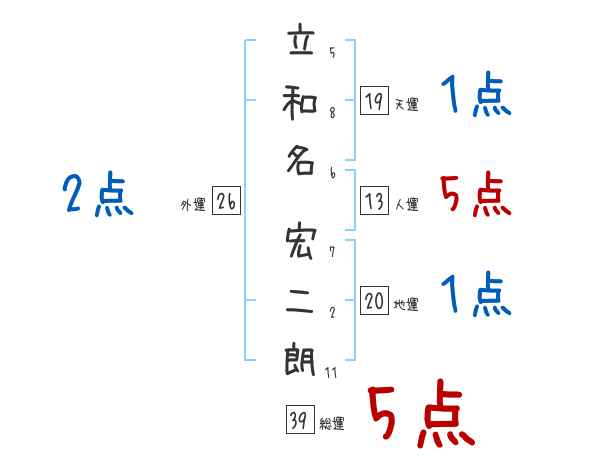 総運![]() | 立和名宏二朗さんの総運は39画の5つ星!社交性に優れ人望が厚い。人の上に立ち成功する。 あなたの人生を表す1番重要な運勢です。生涯を通じて影響する総合運となり、主に50歳以降の晩年期に影響を及ぼします。 |