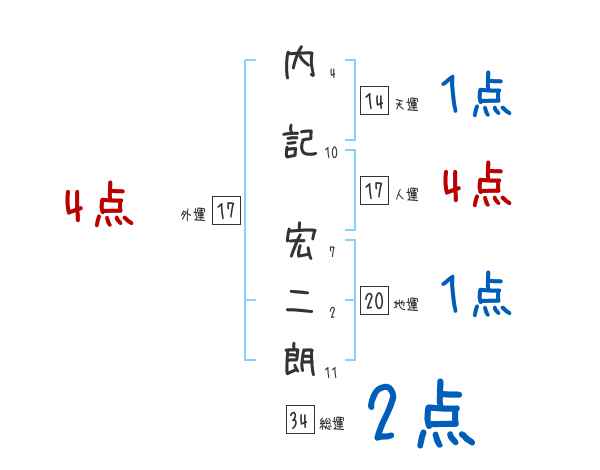 総運![]() | 内記宏二朗さんの総運は34画の2つ星!独創性に優れるが、自尊心が強く災難に注意しましょう。 あなたの人生を表す1番重要な運勢です。生涯を通じて影響する総合運となり、主に50歳以降の晩年期に影響を及ぼします。 |