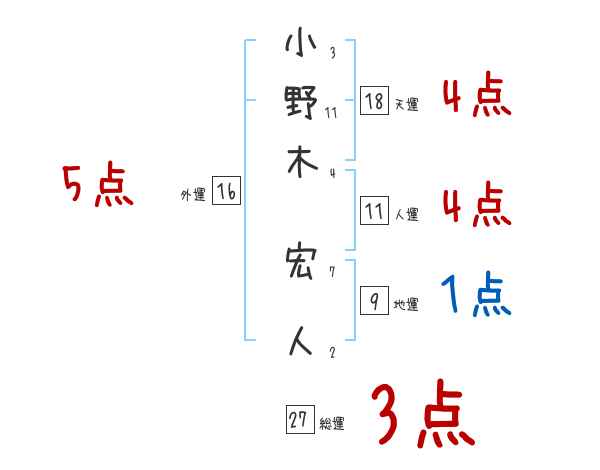天運![]() | 小野木宏人さんの天運は18画の4つ星!情熱的で剛気。忍耐力があり信頼される。 家系が持つ宿命的な運勢を表します。祖先から受け継いだ苗字ですので自分の力が及びません。家柄を象徴します。 |