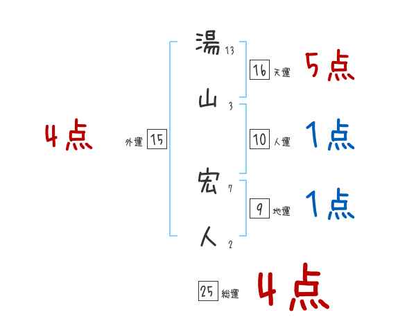 天運![]() | 湯山宏人さんの天運は16画の5つ星!人望が厚く大きく発展する。逆転成功が見える。 家系が持つ宿命的な運勢を表します。祖先から受け継いだ苗字ですので自分の力が及びません。家柄を象徴します。 |