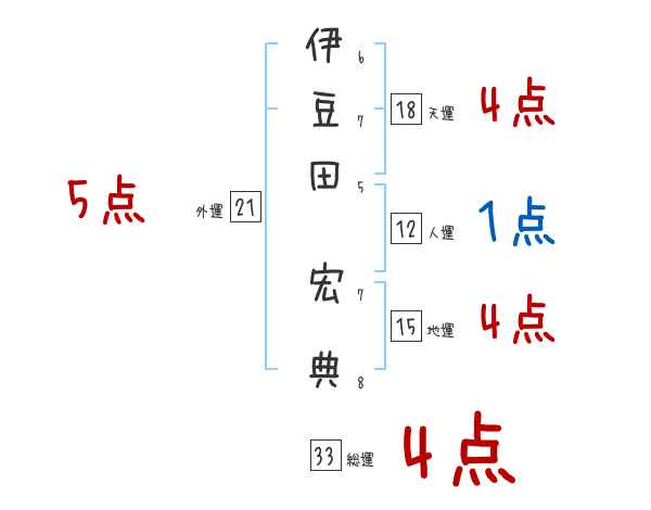 天運![]() | 伊豆田宏典さんの天運は18画の4つ星!情熱的で剛気。忍耐力があり信頼される。 家系が持つ宿命的な運勢を表します。祖先から受け継いだ苗字ですので自分の力が及びません。家柄を象徴します。 |