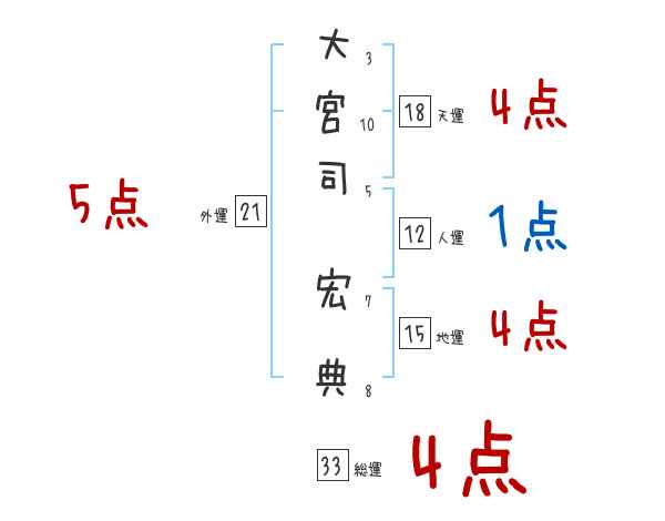 天運![]() | 大宮司宏典さんの天運は18画の4つ星!情熱的で剛気。忍耐力があり信頼される。 家系が持つ宿命的な運勢を表します。祖先から受け継いだ苗字ですので自分の力が及びません。家柄を象徴します。 |