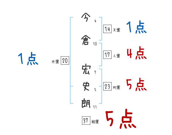 総運![]() | 今倉宏史朗さんの総運は37画の5つ星!努力家で順応性に優れる。現実的な考え方ができ忠実に物事をこなす。 あなたの人生を表す1番重要な運勢です。生涯を通じて影響する総合運となり、主に50歳以降の晩年期に影響を及ぼします。 |