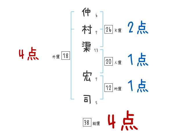 天運![]() | 仲村渠宏司さんの天運は26画の2つ星!波瀾万丈かも。信頼できる人を大事にしましょう。 家系が持つ宿命的な運勢を表します。祖先から受け継いだ苗字ですので自分の力が及びません。家柄を象徴します。 |