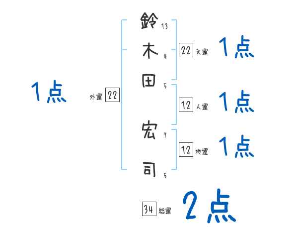 外運![]() | 鈴木田宏司さんの外運は22画の1つ星!努力することが苦手ないっぽう手先が器用。芸術性にも優れる。 生活面を象徴する運勢です。外部から受ける影響力を表し、結婚運、家庭運や職場、環境への順応性を表します。 |