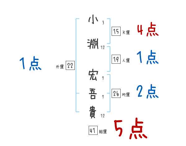 外運![]() | 小淵宏吾貴さんの外運は22画の1つ星!努力することが苦手ないっぽう手先が器用。芸術性にも優れる。 生活面を象徴する運勢です。外部から受ける影響力を表し、結婚運、家庭運や職場、環境への順応性を表します。 |
