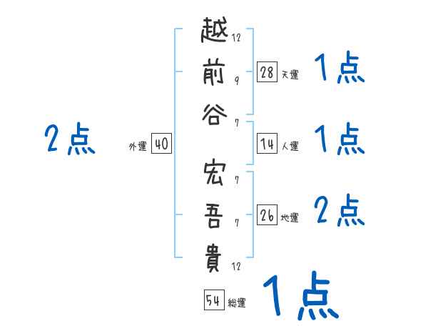 外運![]() | 越前谷宏吾貴さんの外運は40画の2つ星!自信過剰で物事に固執するためトラブルに注意。 生活面を象徴する運勢です。外部から受ける影響力を表し、結婚運、家庭運や職場、環境への順応性を表します。 |