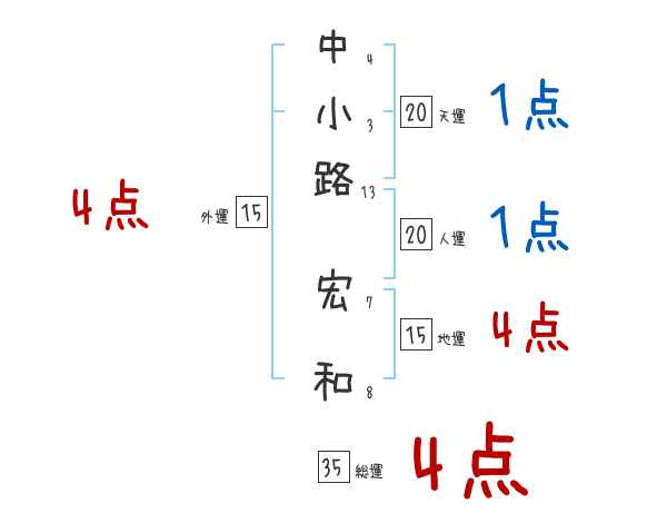 地運![]() | 中小路宏和さんの地運は15画の4つ星!人徳があり出世する。順調に物事を進め円満な人生。 個性を表す基礎的な運勢です。性格形成や対人関係、行動力など家庭環境に影響されます。主に誕生してから20歳くらいまでの若年期の運勢を表します。 |