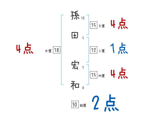 総運![]() | 孫田宏和さんの総運は30画の2つ星!浮き沈みの激しさに注意しましょう。 あなたの人生を表す1番重要な運勢です。生涯を通じて影響する総合運となり、主に50歳以降の晩年期に影響を及ぼします。 |